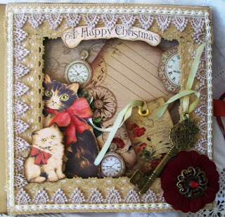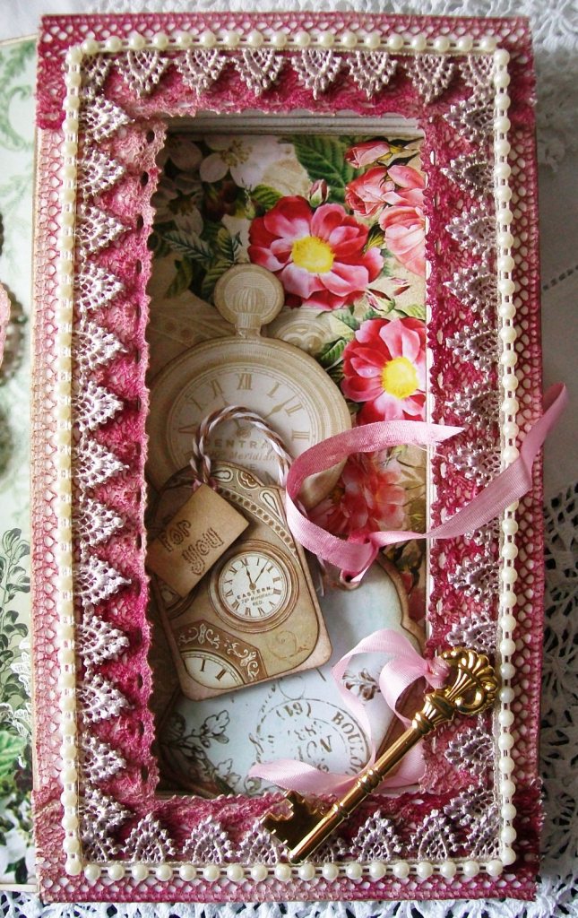 Ø When you are happy with your decorating, using a strong adhesive/or glue to adhere your shadow-box into your book card.